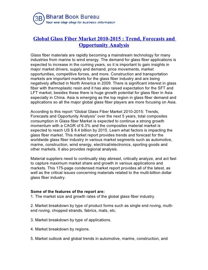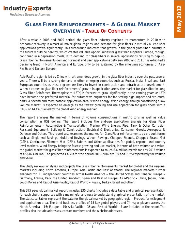 Glass Fibers: Fiberglass/Glass Wool and Glass Fiber Reinforcements - A Global Market Overview. Date: April 13, 2012 Pages: 667 Price: US$ 4,590.00 ... Access Doc